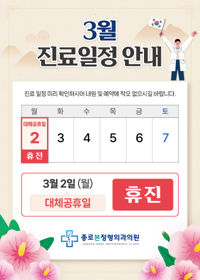 3월 진료일정 안내 페이지 정보 작성자 종로본정형외과 연락처 작성일 작성일26-02-19 12:17 목록 본문 종로본정형외과3월 진료 일정 안내드립니다.3월 1일(일)[삼일절]휴 진3월 2일(월)[대체공휴일]휴 진진료 일정과 시간 미리 확인하시어내원 및 예약에 착오 없으시길 바랍니다.감사합니다. 목록